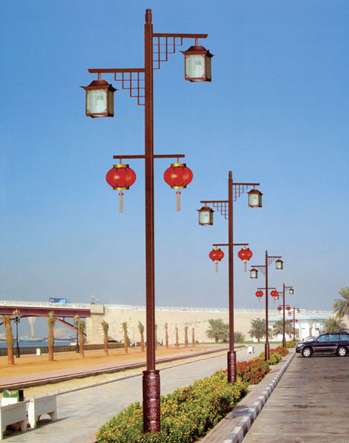 特色仿古庭院灯是众多景观照明类庭院灯的其中的一种类型,其设计元素主要采用中国古典,特有的民族风格等其灯具样式包含有古典宫灯造型、马灯造型、编钟、仿古灯笼造型以及当地特色产品或特有文化的标志性物体造型;再加之灯杆外观加以古典元素和特有的造型运用和改型;灯体外观颜色可根据古典庭院灯样式造型及文化特色喷涂如仿古铜色,木纹色,纯黑色,中国红色等非常有特色;